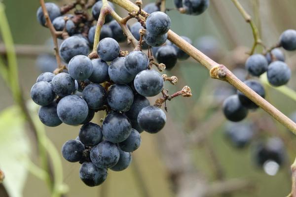 The leaves vary greatly among them, being able to be tri- or pentalobulated, oval or round. They measure between 10 and 25 cm and are serrated on the margins. Come fall, the green color of the leaves will turn to red and yellow tones. It is widely used in the wine and table grape industry. The fruits are black to purple in color, as shown in the photo. They vary in color, acidity level and sweetness.