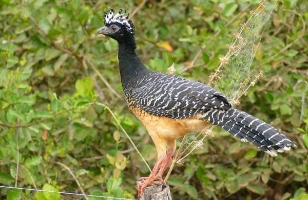 The Bare-faced Curassow (Crax fasciolata) is a large bird, reaching a length of 82 to 92 cm (32 to 36 in). It is found in Brazil, Paraguay, and eastern Bolivia, as well as in extreme northeastern Argentina. It feeds mainly on fruits, but also on seeds, flowers and small invertebrates. Furthermore, it exhibits sexual dimorphism and has been declared a natural monument in the Argentine province of Formosa.