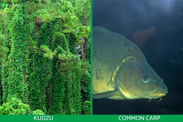 - Kudzu (Pueraria montana): this is a plant which was introduced to the Southeastern U.S. as a means of preventing soil erosion, but resulted in it becoming known as the vine that ate the South. It smothers native vegetation by blocking sunlight and outcompeting native plants for nutrients and space.