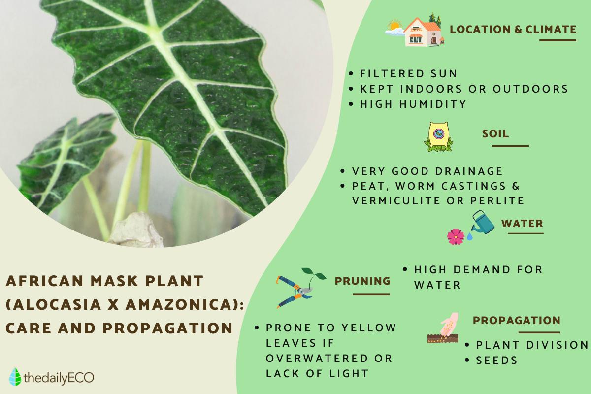 Alocasia x amazonica is a popular hybrid known by the name of the African mask plant. Its care required filtered bright light, a minimum ambient temperature of 15-18 ºC (59-64.4 ºF), nourished soil with good drainage and high humidity. Yellow leaves in the African mask plant are due to excess watering, low ambient temperature or lack of fertilizer.