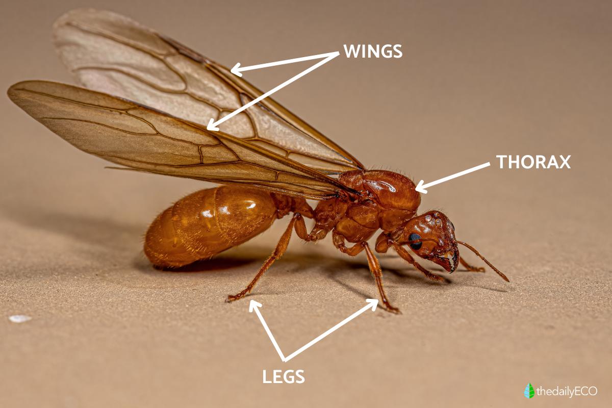 Ants have very complex social structures. In part, their morphology is determined by the function they have within the colony. This can be seen especially in the wings. In general, no worker ants have wings. Queens and males do because they have to undertake nuptial flights to reproduce. This can vary a little depending on the species of ant. The diagram below shows an adult female queen ant with wings.
