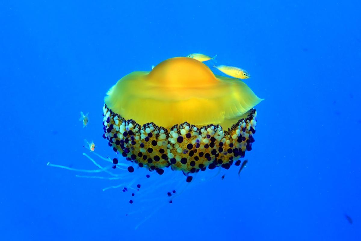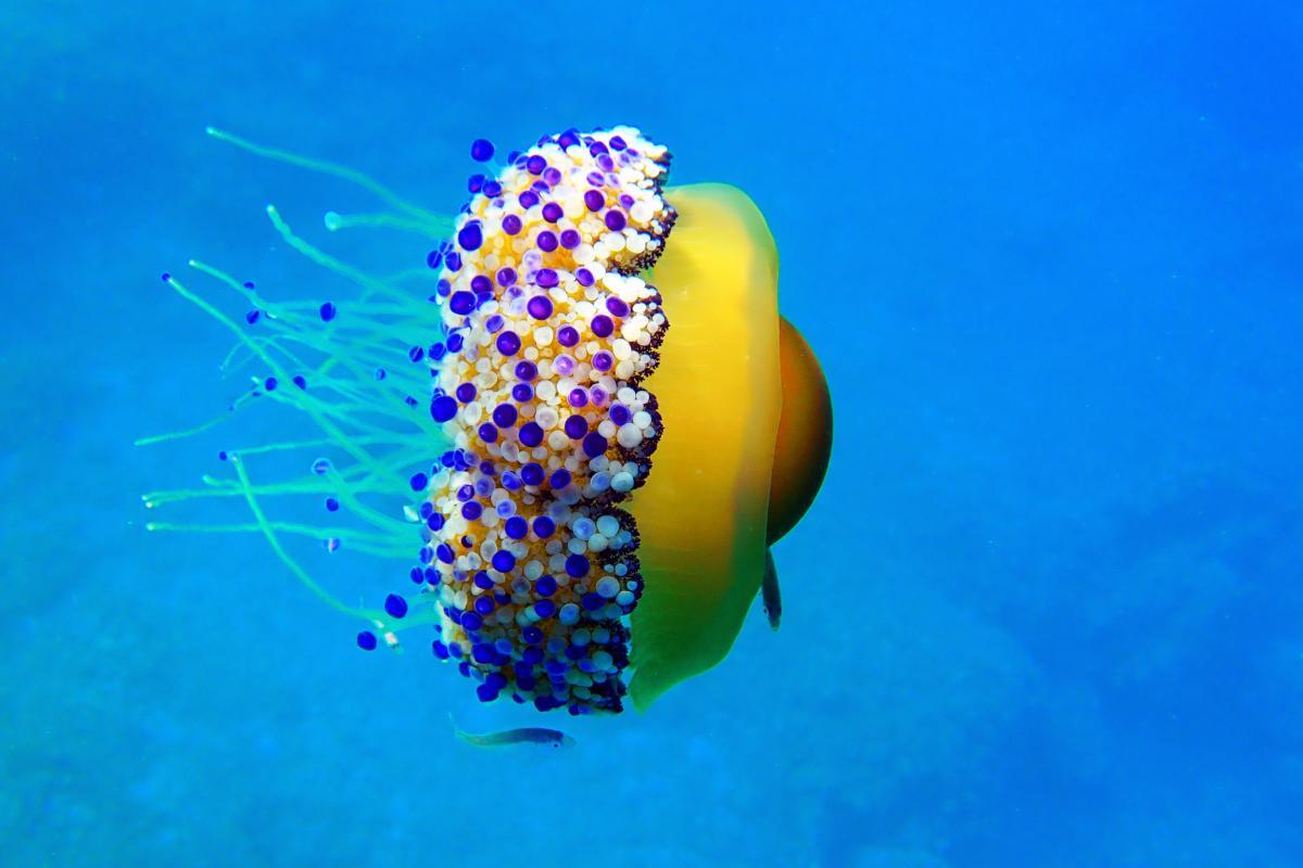 Also known as the Mediterranean jellyfish, the friend egg jellyfish (Cotylorhiza tuberculata) is the medusa stage of a sea jelly which lives mainly in European waters. Its common name is thanks to its distinctive shape and coloring, giving it the appearance of a fried chicken egg. The umbrella or bell of the main body has a yellowish ring with an orange dome in the middle, similar to the albumen and yolk of a friend egg. Although beautiful and mysterious, jellyfish are known to have a sting. This leads thedailyECO to ask, are fried egg jellyfish poisonous?