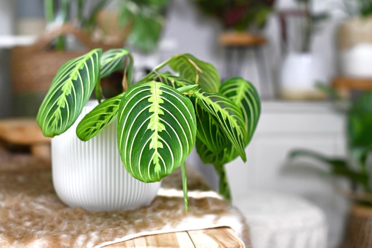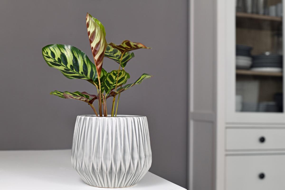 There is a wide variety of calathea plants, including different colors. Their leaves can be variegated with red veins running over their dark green leaves. Some even look as if they were painted in watercolors. They grow very well indoors and need a somewhat humid environment. They need their leaves to be sprayed with water, either with the spray or with a humidifier that allows them to concentrate the humidity around them.