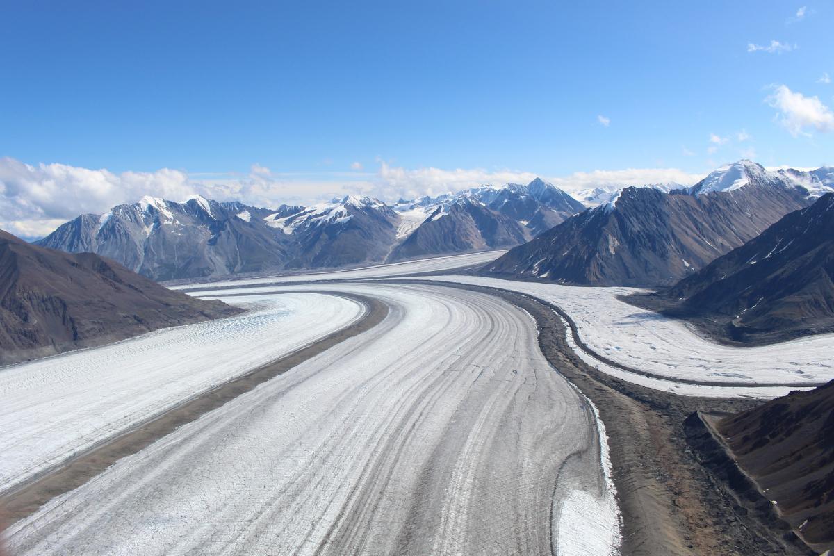 The Kaskawulsh Glacier is the second biggest glacier in North America, occupying an area of 39,000 km² with a width of 480 to 640 meters. It is located in the San Elias mountain range within Kluane National Park, in southeastern Alaska.