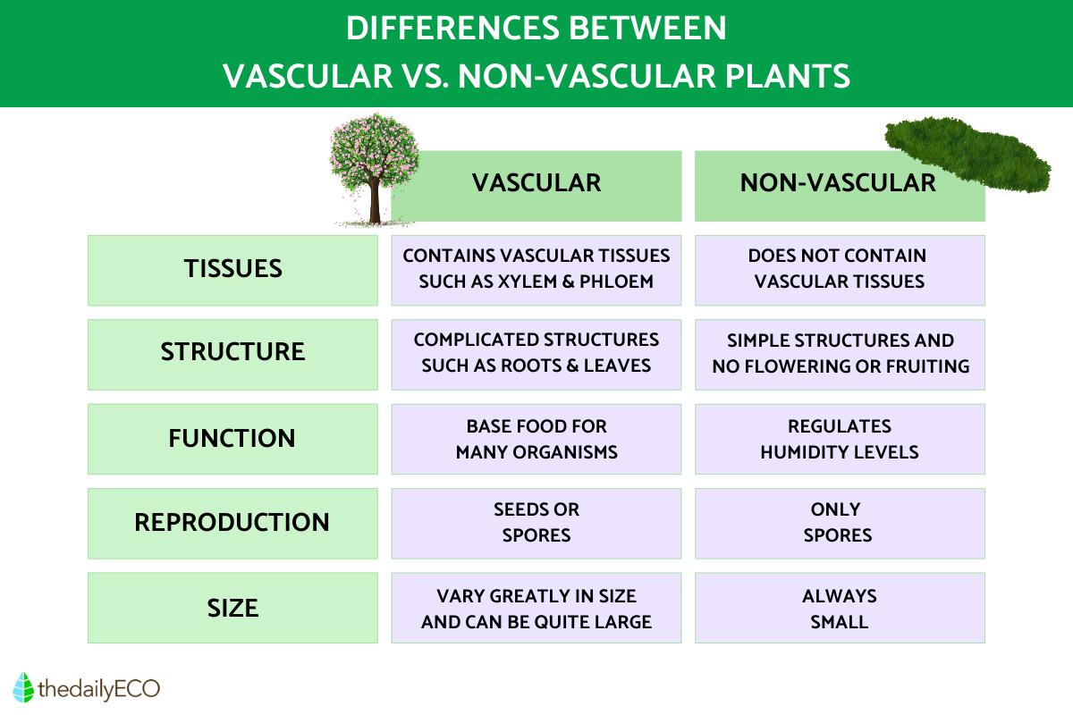 - Reproduction: vascular plants can reproduce by both seeds and spores, but non-vascular plants can only reproduce by spores under favorable conditions.