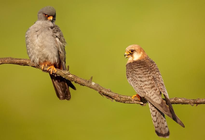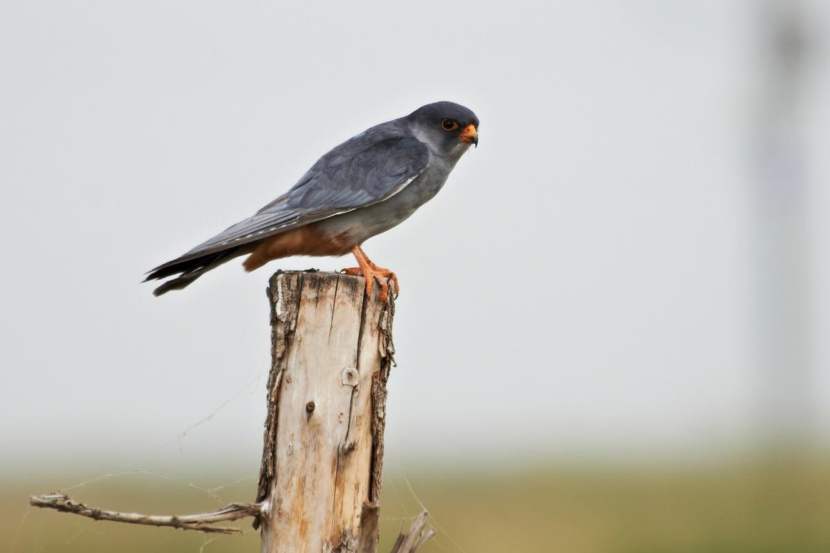 A migratory bird found in eastern Europe and Asia, wintering in Africa. Males have blue-grey plumage and orange legs, while the female has orange tones. Its diet consists mainly of large insects, small mammals and birds. It captures its prey using a characteristic gliding flight. They are medium sized, but have long wings relative to their body. Their common name derives from the brightness of their feet.