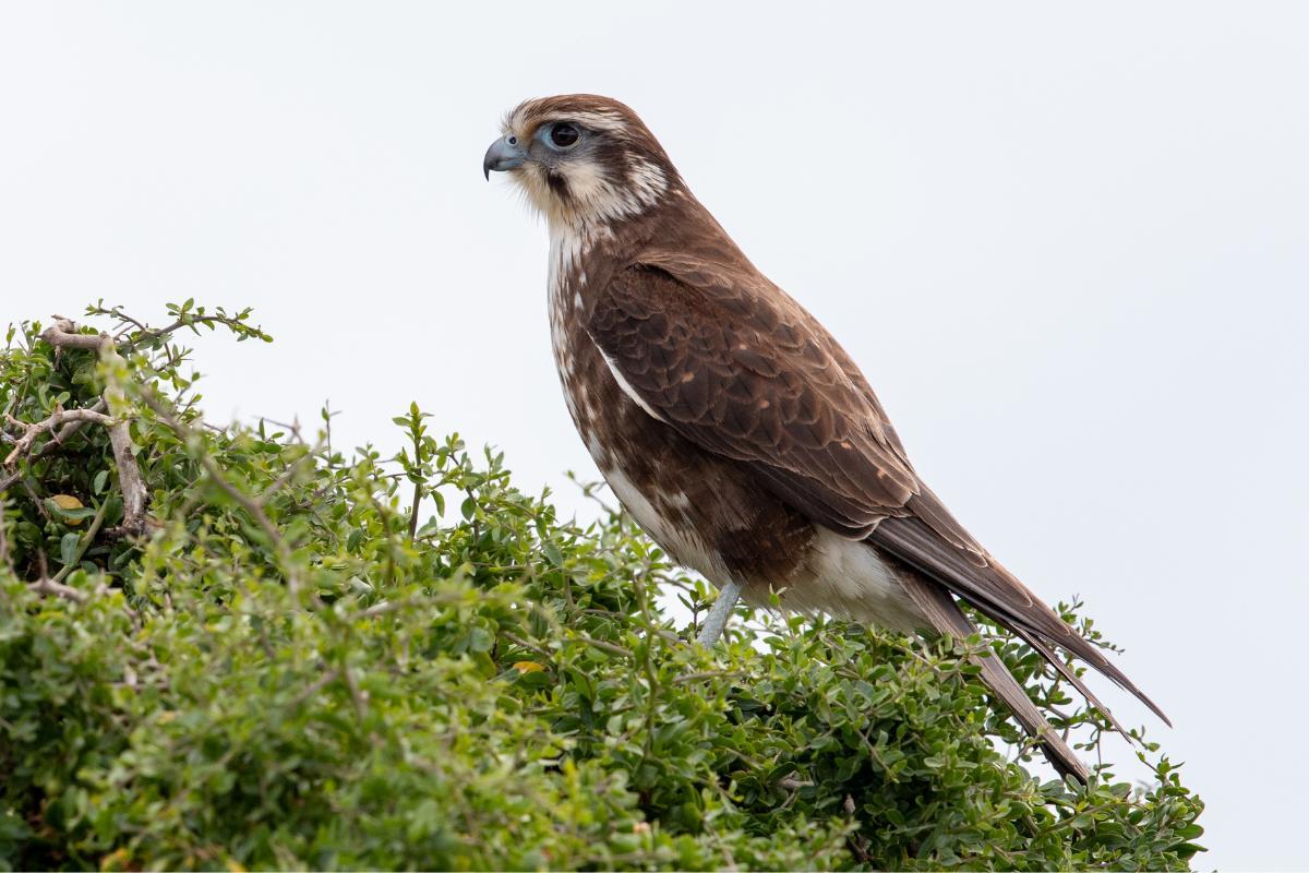 As you can see in the picture below, the brown falcon is a type of falcon with brown plumage. It also has some mottled white feathers, especially on the underparts and around the face. They are a relatively large type of falcon and are said to sometimes start fires to help prey on animals.