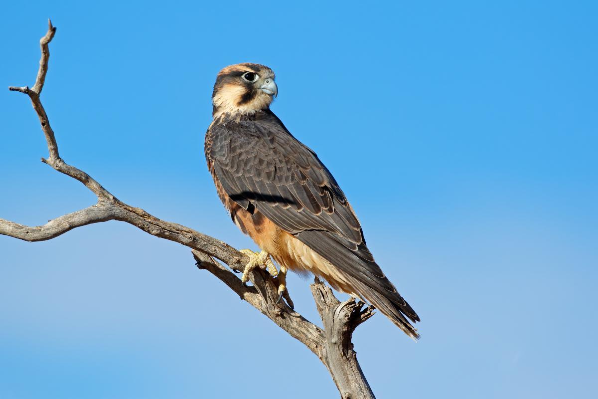 A bird of prey that lives in India and sub-Saharan Africa, this type of falcon prefers semi-deserts and savannas. They have a distinctive reddish-brown head with gray back, wings and tail. It feeds on birds, bats and insects, hunting in agile flight. They usually hunt in pairs, showing their expertise in coordinated strikes.