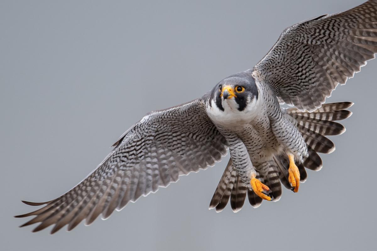 One of the most famous types of wild falcon, its notoriety is partly because it is a cosmopolitan species that inhabits areas as distant as the Arctic tundra and the tropics. Its has blue-gray plumage and striped white underparts. Its legs, beak and eye contour are a bright yellow, as can be seen in the picture below. It feeds mainly on birds in flight, reaching speeds of over 200 mph (320 kph).