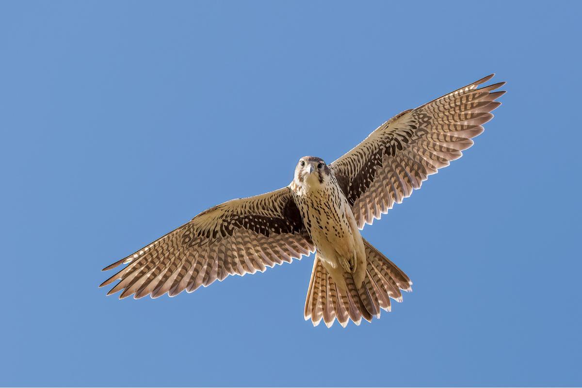 A medium-sized bird that lives in western North America, ranging from Canada to northern Mexico. It is a large type of falcon with gray-brown, spotted plumage. It feeds mainly on small mammals and birds, hunting in rapid flight. While it is similar to the peregrine falcon, it can be differentiated from its flight patterns and its distinctive call. They are also more opportunistic in terms of diet.