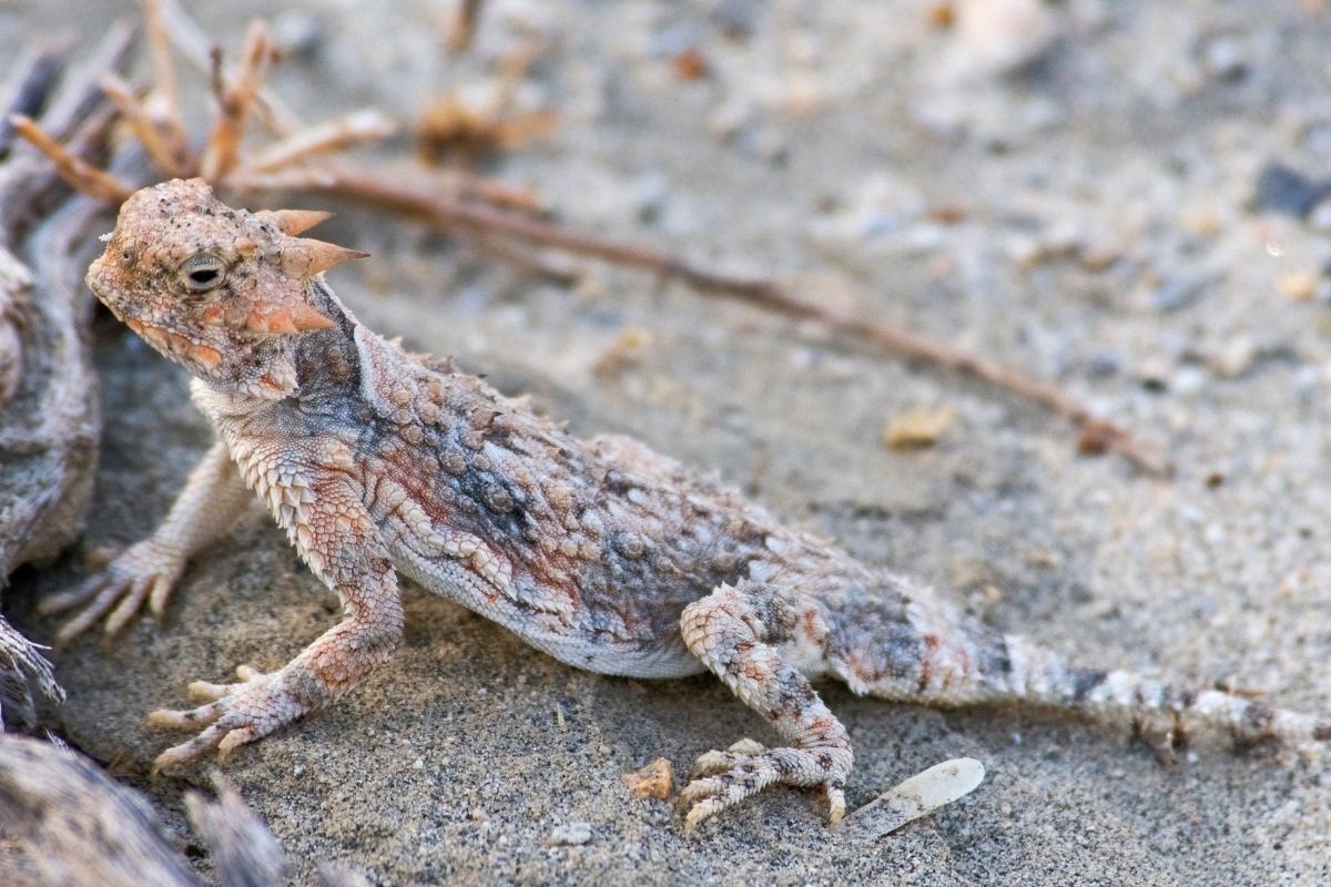 The desert horned lizard (Phrynosoma platyrhinos) is found in northern Mexico and the southern United States. Its body is covered with small spines and its head has a crown of horn-like structures. They live in deserts and their coloration is similar to that of their habitat, allowing for supreme camouflage. To further hide from predators and hunt their prey, they often cover themselves with sand, leaving only their head exposed for surveillance.
