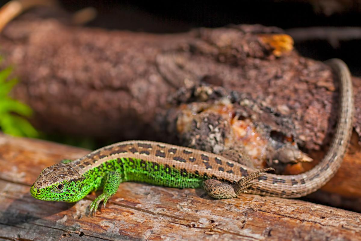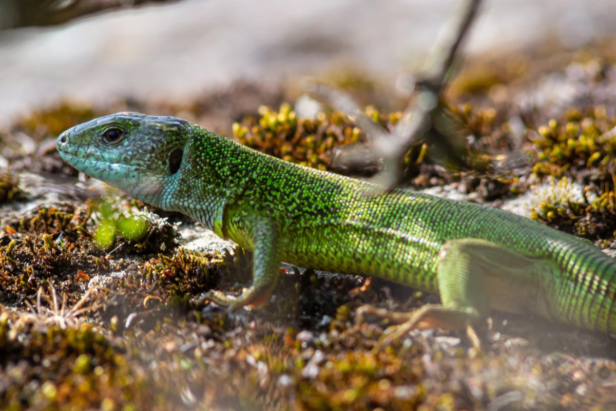 Belonging to the Lacertidae family, the European green lizard (Lacerta viridis) is distributed throughout Europe and Asia. It usually lives in environments with dense shrub vegetation, as well as open forests, field margins, embankments and thickets. Males are green with black spots on the back, while females are brighter green in color. In mid-spring both sexes acquire a bluish coloration on the jaws, although it is more distinct in males.