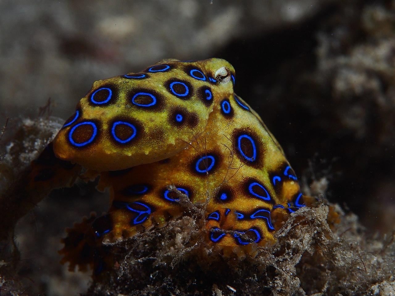 The greater blue-ringed octopus measures just between 4-6" (10-15 cm). It is extremely poisonous and its toxins are sufficiently potent to kill a human being in the right circumstances. It is identified by its large large blue rings that contrast against its yellow skin. When it feels threatened, it raises the intense blue tone of its rings to warn any potential predators of their great danger.