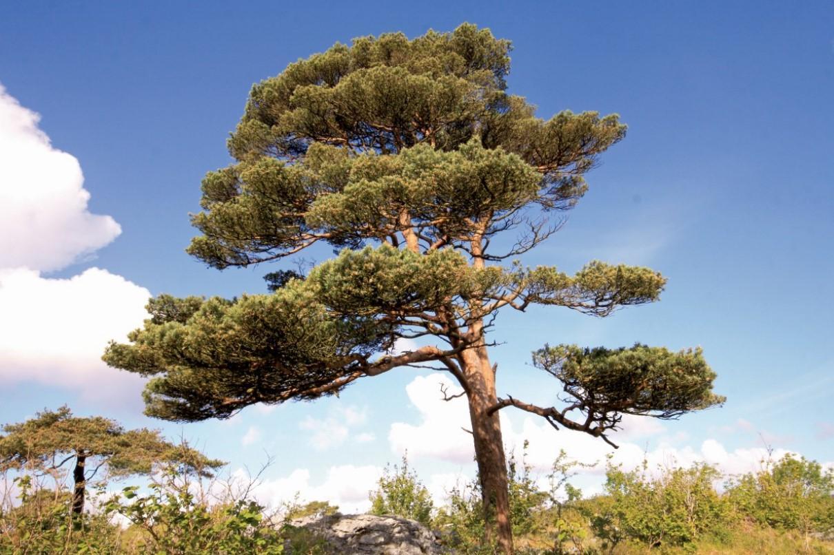 One of the best known of all the different types of pine trees. The Pinus pinea, or stone pine, is also native to the Mediterranean and can reach up to 164'/50 m in height. Generally, it usually measures about 39'/12 m. It has a straight trunk with an almost orange-brown bark. Another characteristic of this pine is that its leaves are arranged in the shape of an umbrella and can measure up to 8"/20 cm long.