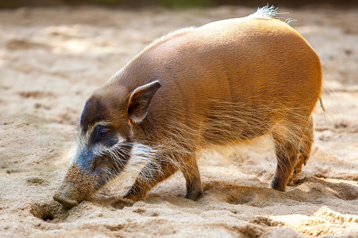 Confusingly, the red river hog (Potamochoerus porcus) is also sometimes known as a bushpig. It is a type of swine that lives in the forests of Guinea and Congo, preferring areas near rivers and swamps. Its coat ranges from orange to reddish brown and has characteristic white markings.