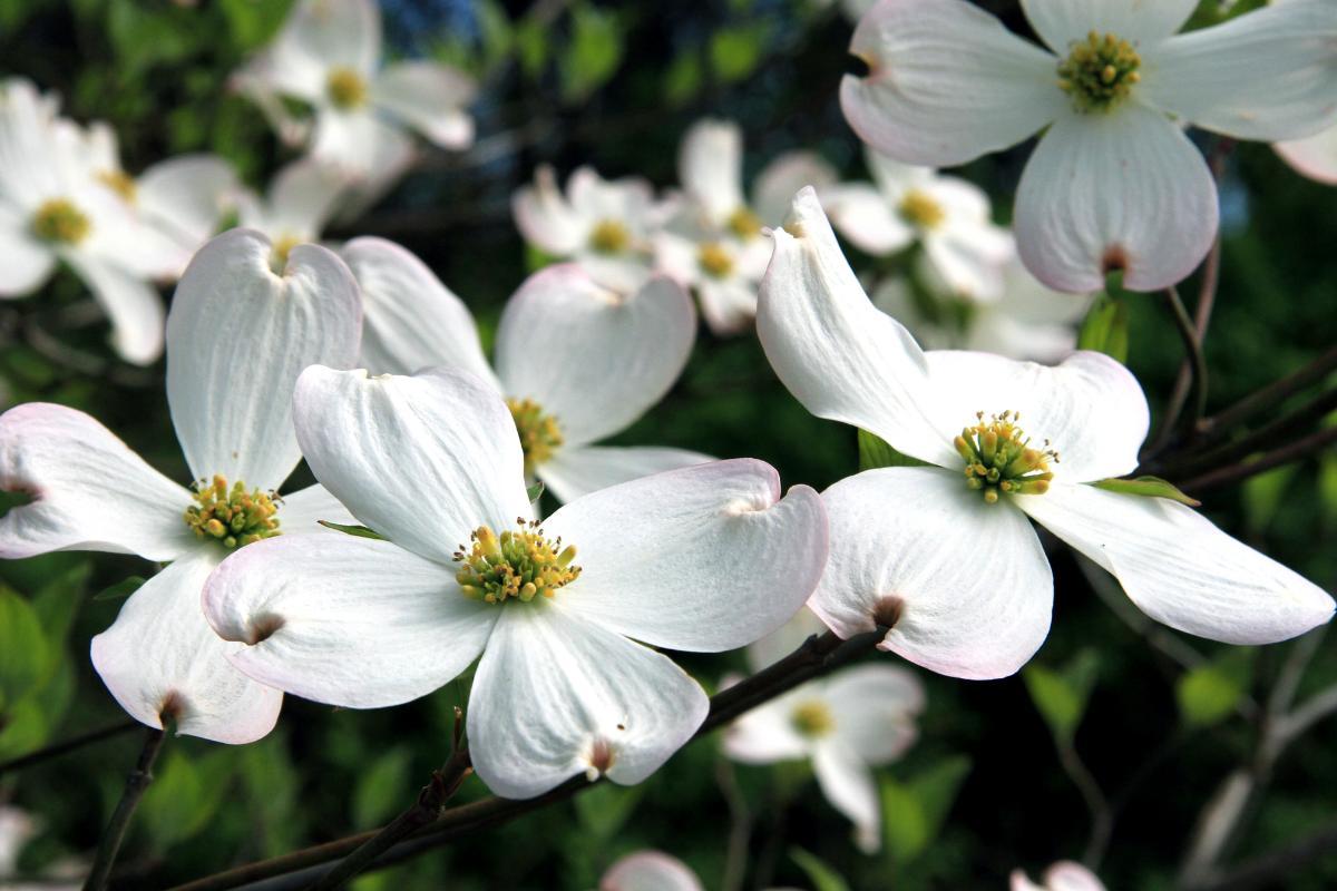 Another tree that flowers in April, the flowering dogwood is noted for its beautiful blooms. While its large white bracts appear as if they are the petals of a flower, the inflorescence is actually the small green balls which appear in the center. You can see this in the photo we share below. There are also some pink cultivars. When blooming, its leaves drop and are replaced by these flowers.
