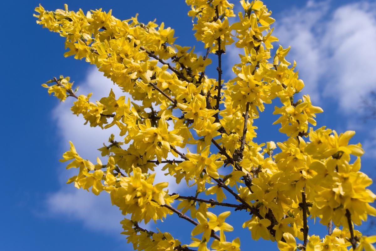 This is a shrub that produces highly valuable flowers. They have four petals and completely cover branches that have lost their leaves. You can see forsythia in bloom in the photo below. They're also unusual because these flowers point toward the sun.