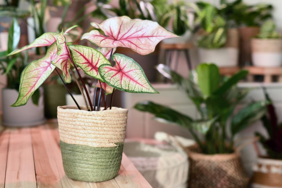 Plants of the genus Caladium are often known as elephant ear plants or heart of Jesus plants. It is one of the most spectacular plants with heart-shaped leaves, especially when we consider its diverse species and cultivars. These cultivars have leaves with combined tones which contrast light and dark colors such as pink, red, burgundy, white and violet.