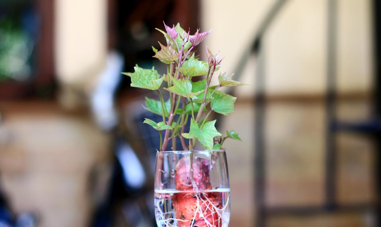 You can also grow sweet potato plants directly in water. Sweet potato plants will continue to grow in water for months or even years, whether they come from cuttings or a tuber. Ensure that the water level stays constant and that the container is emptied and refilled with clean water every few weeks in order to prevent bacteria growth.