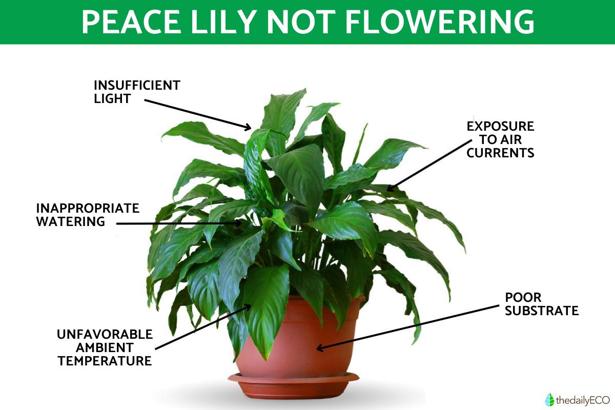 If the ambient temperate for the peace lily is unfavorable, it can seriously affect its development. This doesn't mean it will die. The leaves and other parts of the plant will often remain healthy, but the flower itself does not bloom. The most favorable ambient temperature for peace lilies is around 70-77ºF (21-25ºC). If the temperature is above or below this range, the plant is much less likely to bloom.