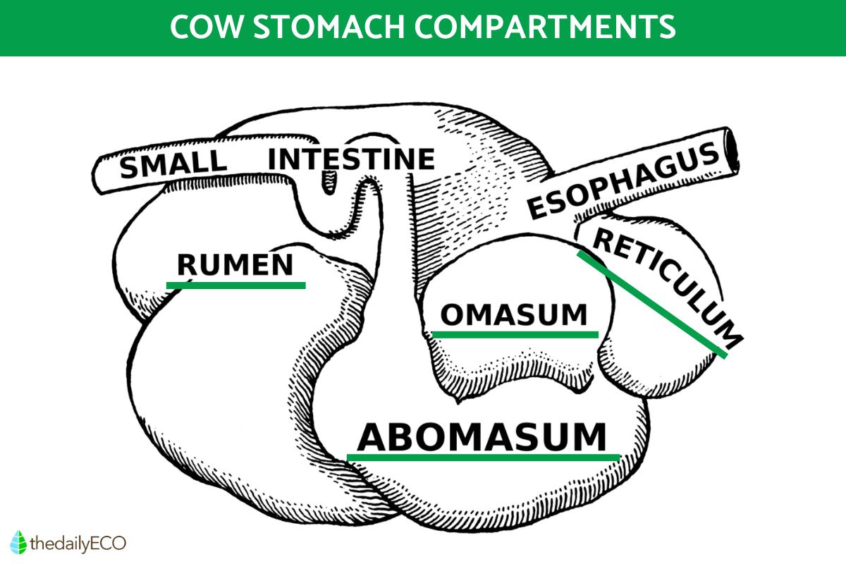 These different parts of a cow's stomach are highlighted in the diagram below: