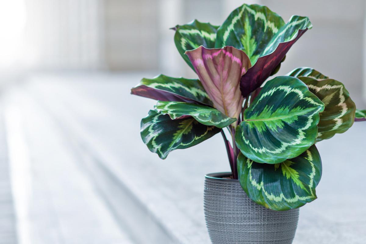 Another plant with colorful leaves is the calathea, sometimes known as the prayer plant. The leaves are large and colorfully patterned, presenting in different shapes depending on the variety. The leaves of this colorful plant are often variegated green on top and a reddish purple on the bottom, as you can see in the photo below. To help it stay healthy you will need to make sure it receives indirect light and abundant watering during spring and summer.