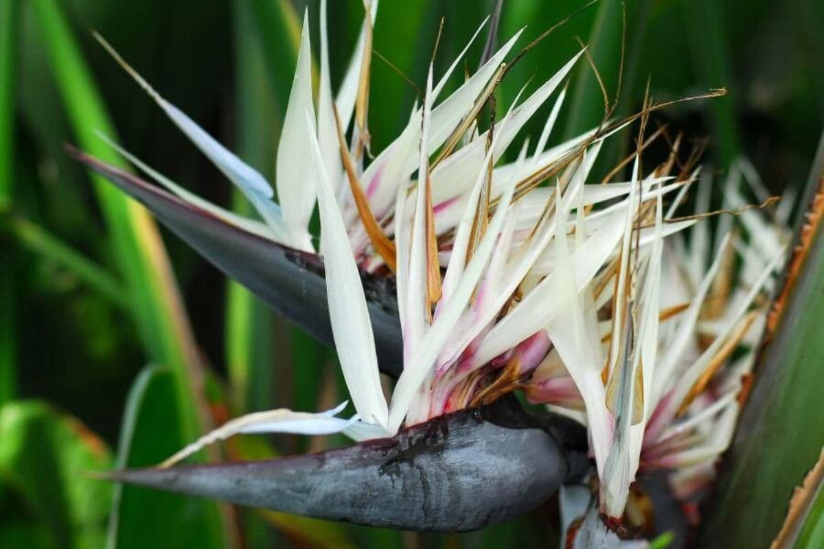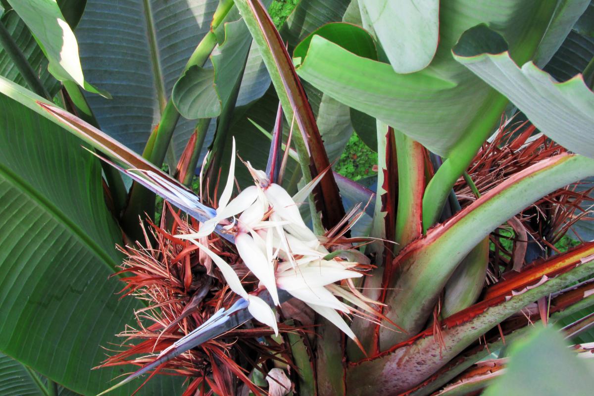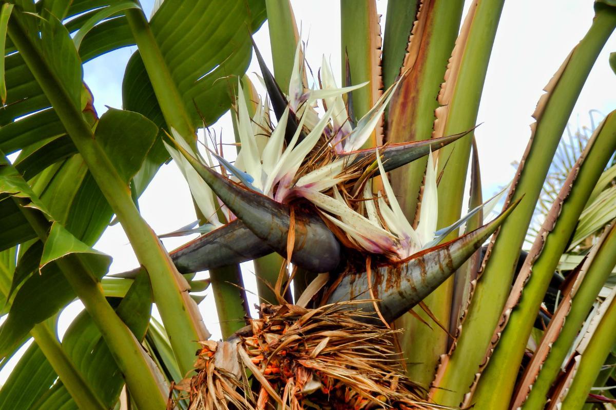 - One of Strelitzia nicolai's most captivating features is its stunning flowers. These large, bird-like blossoms emerge from a hard, beak-shaped spathe, which gives rise to long-lasting flowers with white petals and blue tongues, resembling exotic birds in flight. The flowers can be up to 18 centimeters (7 inches) long and grow in clusters.