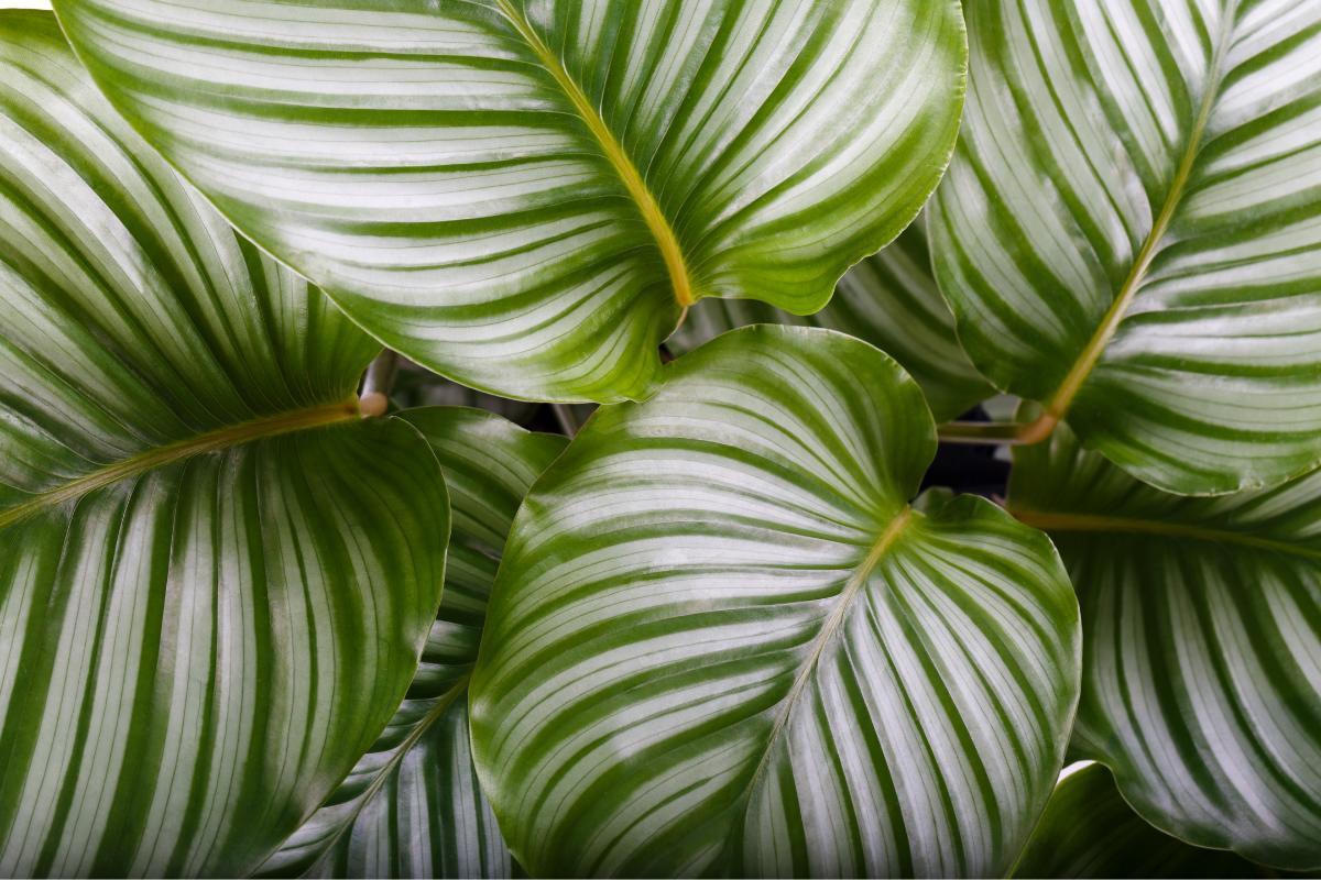 From the genus Calathea and considered a type of prayer plant, calatheas are characterized by having very striking leaves with white, purple or pink patterns. They depend on a warm temperature above 18 ºC/64.4 ºF and need low to medium light. Prolonged exposure to direct sunlight will burn the fragile and thin leaves, but this partial shade plant needs some sun to thrive.