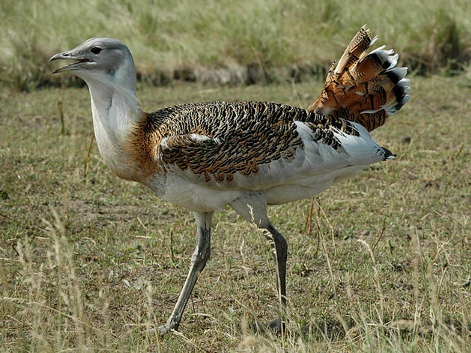 The great bustard (Otis tarda) is considered one of the heaviest birds in the world and is common in Europe, Asia and as far as the African continent. It inhabits steppes and grasslands, but also cultivated areas, as much of its natural habitat has been displaced by agricultural expansion. A male is typically 90-105 cm (2 ft 11 in – 3 ft 5 in) tall, about 115 cm (3 ft 9 in) and has a wingspan of 2.1-2.7 m (6 ft 11 in – 8 ft 10 in).