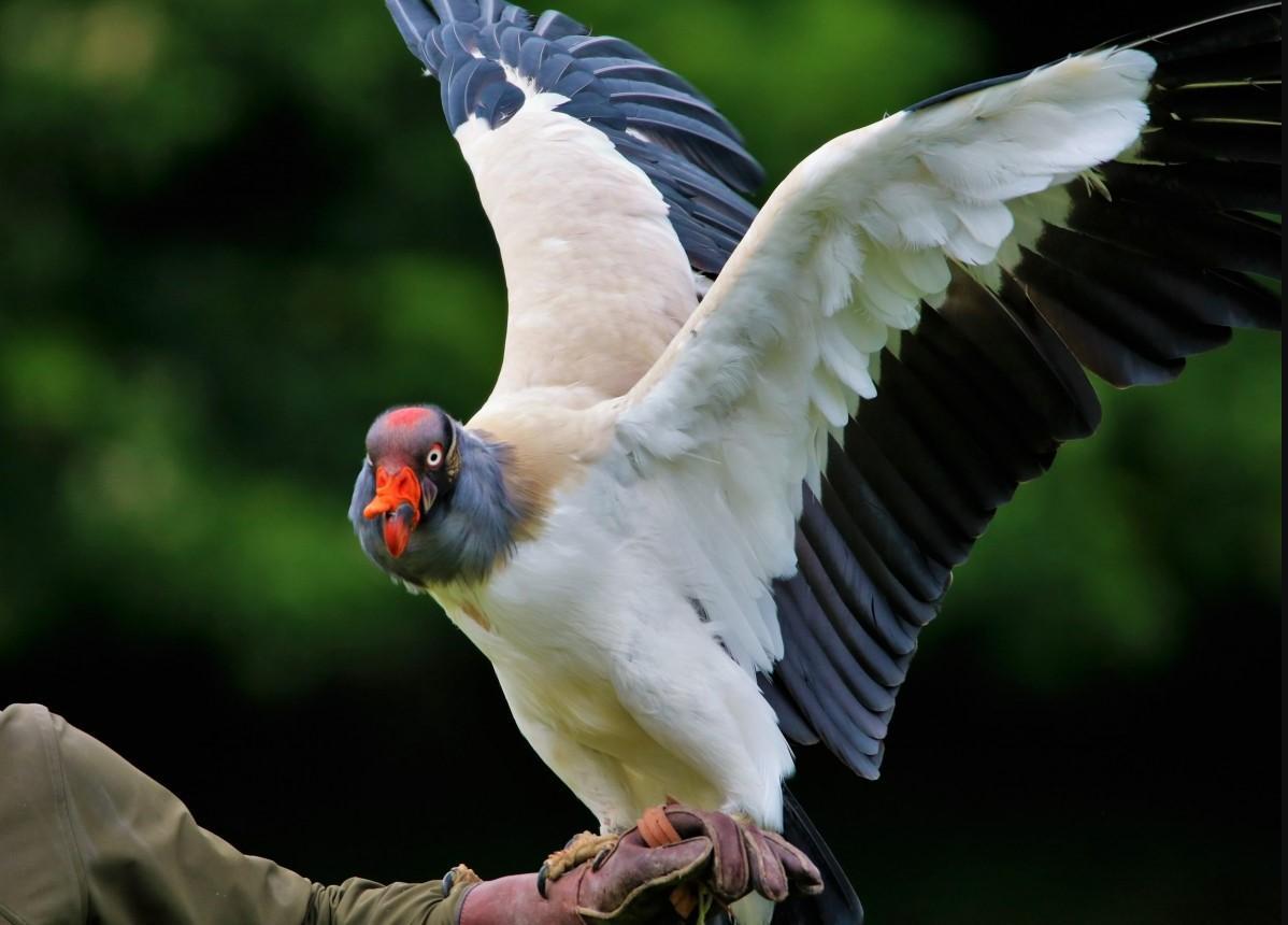 The King Vulture (Sarcoramphus papa) is a large bird with a wingspan of 1.9 m (ca 74 in) and a height of 76 cm (ca 29 in). Its plumage has a very striking coloration, its beak is orange, and its eye has a white iris surrounded by a red sclera.
