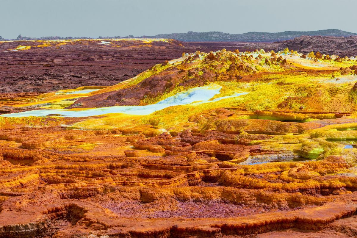 Despite the harsh conditions, the Danakil Depression boasts a unique and fascinating landscape. The aridity and high temperatures lead to the formation of extensive salt flats, creating a surreal and visually striking landscape. Mineral-rich springs and volcanic activity contribute to multi-colored deposits throughout the depression.