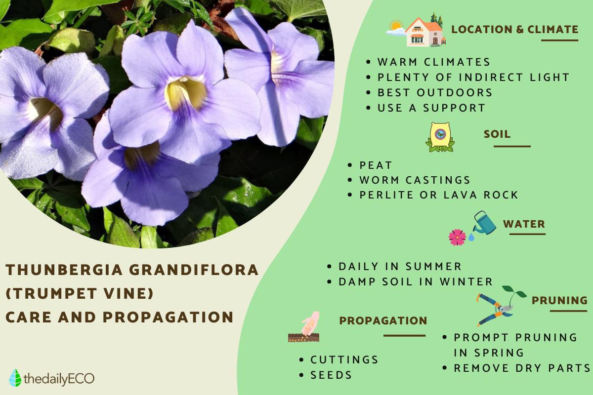Propagation is the reproduction of the plant to grow new trumpet vines. Thunbergia grandiflora is propagated by seeds or cuttings. If you choose to propagate Thunbergia grandiflora with seeds, know the growth and development of the plant will be slower.