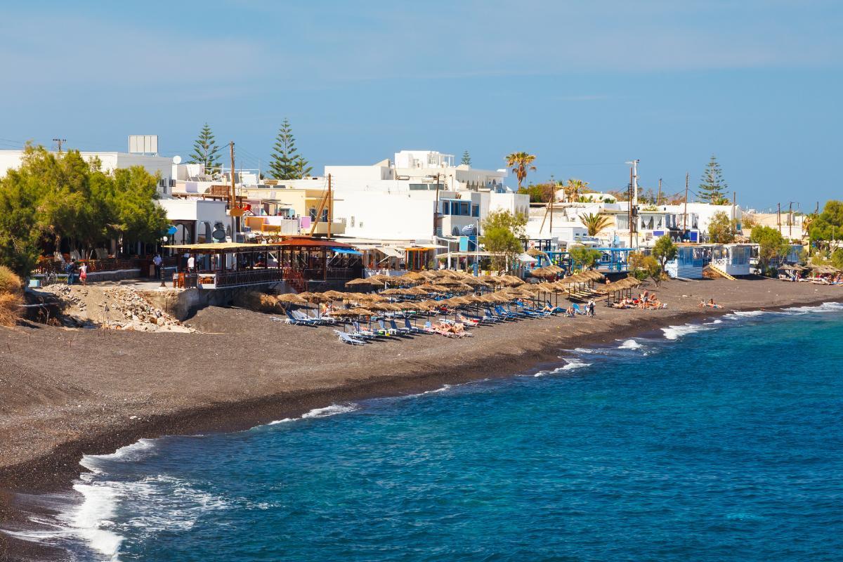 Bathed by the Aegean Sea, Kamari is an organized beach featuring umbrellas and numerous bars and restaurants that cater to visitors. While the volcanic environment results in scarce flora, the marine fauna is diverse, offering excellent opportunities for diving and snorkeling.