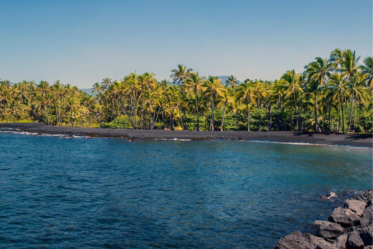 Enveloped by coconut trees and lush tropical vegetation, Punaluu Black Sand Beach, with its Pacific Ocean shoreline, offers an ideal destination for wildlife observation and a serene experience of Hawaii's natural beauty.
