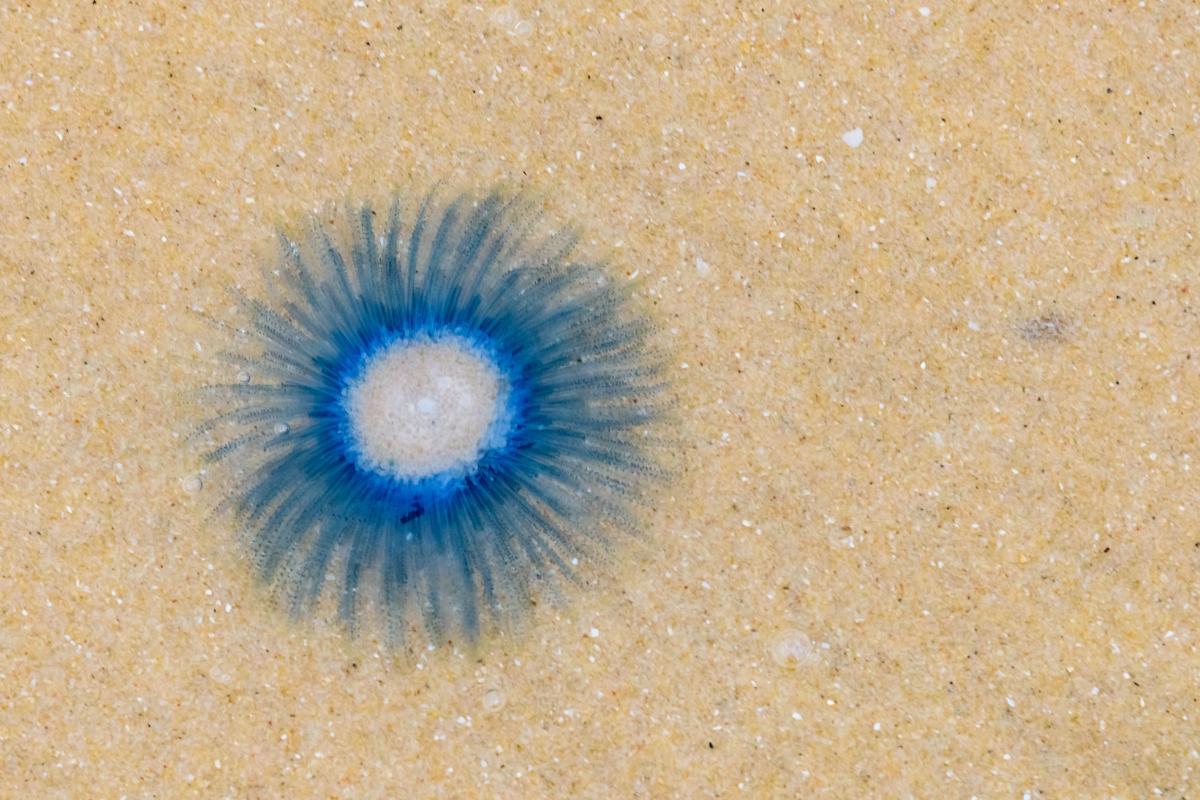 In general, the phase that we usually observe in their life cycle corresponds to a floating colony of polyps. Its disk can measure 5 cm and is made up of a hard float filled with gas in the center and a colony of intense blue, purple or yellow hydroids. These hydroids resemble tentacles and contain nematocysts which essentially function to same as true jellyfish. The sting of the blue button jellyfish is mildly stinging, but can cause slight skin irritation.