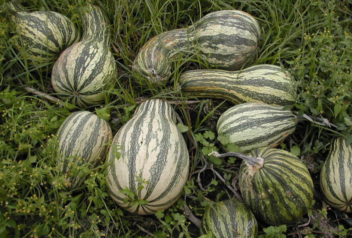 The cushaw squash is native to Mesoamerica. This is the variety of pumpkin that is mainly used to obtain the seeds that are used as a dried fruit or snack. This pumpkin is also used to prepare green mole, a type of Mexican sauce made with a various other ingredients. The flowers and pulp are also consumed, but of all the domesticated varieties, it is the least popular outside of the Americas. The fruit has green stripes alternating with white, as shown in the photo below.