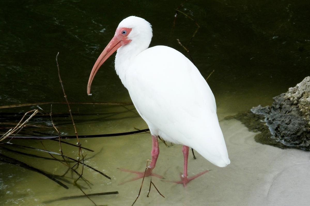 The American white ibis is a medium-sized wading bird. It is recognizable by its all-white plumage which contrasts with its characteristic long, down-curved, pinkish or orange bill and legs. It is widely distributed in humid areas of the southeastern United States, Central America, South America and the Caribbean. It prefers habitats such as marshes, mangroves, lagoon edges and estuaries. It feeds on insects, crustaceans and small fish that it catches by probing the mud with its bill.