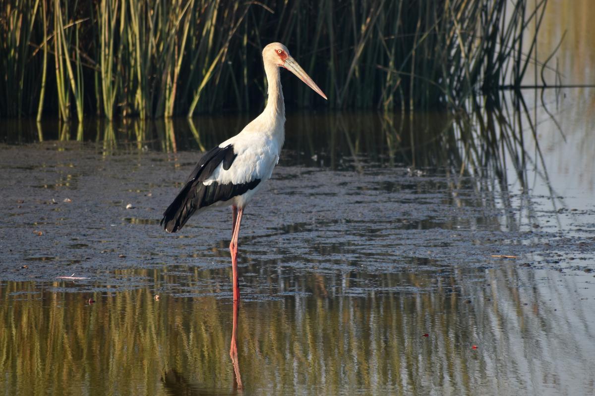 The maguari stork is a large bird that can reach 4.2 ft (1.3 m) in length. It has a large beak and elongated reddish legs. Found in wetlands in tropical and subtropical areas of the Americas, they feed on fish, crabs, mollusks, crustaceans and insects. They form small flocks and usually fly at high altitudes.