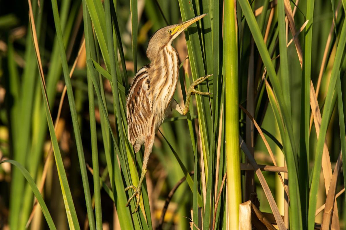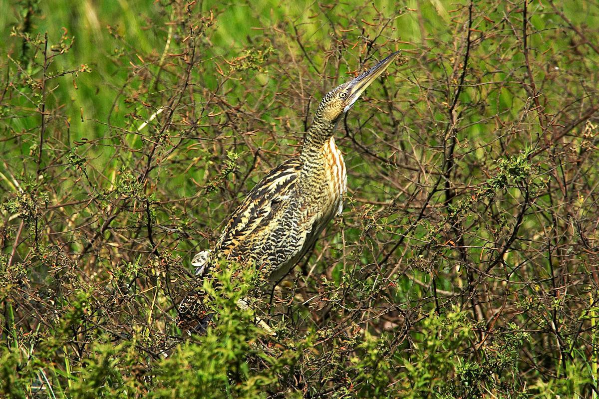Also known as the South American bittern, the pinnated bittern is a large wading bird found in tropical America, specifically in areas with tall grasses or reeds. It is solitary and has cryptic, light-brown plumage with brown markings. It is a patient and agile hunter that feeds on fish, insects, amphibians and small mammals. The picture only shows the bittern neck extension which is generally shorter than that of other heron-type birds.