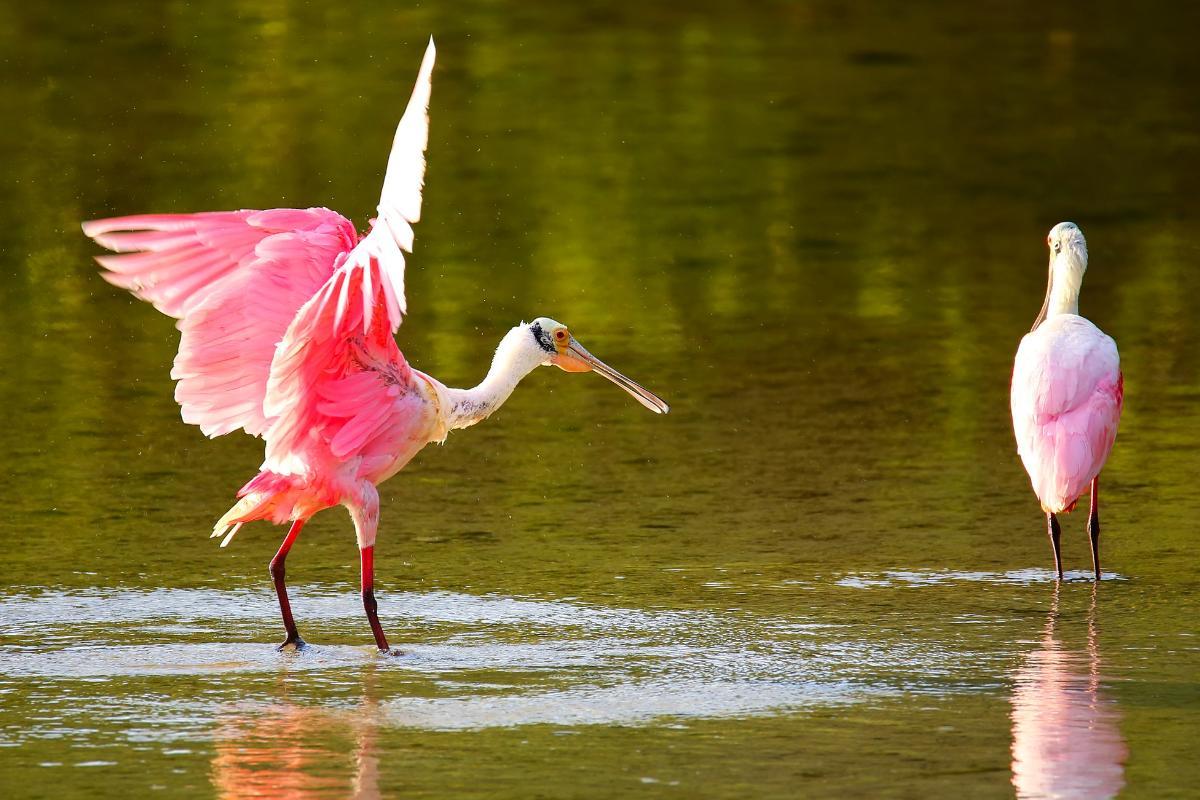 As you can see in the picture below, the roseate spoonbill is a very striking type of wading bird. Their common name is a result of their distinctive bill which is very long and shaped like a spoon at the distal end. Similar to the flamingo, they are also known for their pink plumage which is a result of the high levels of certain carotenoids in their diet. Age, location and breeding status can also affect the coloration of their plumage.
