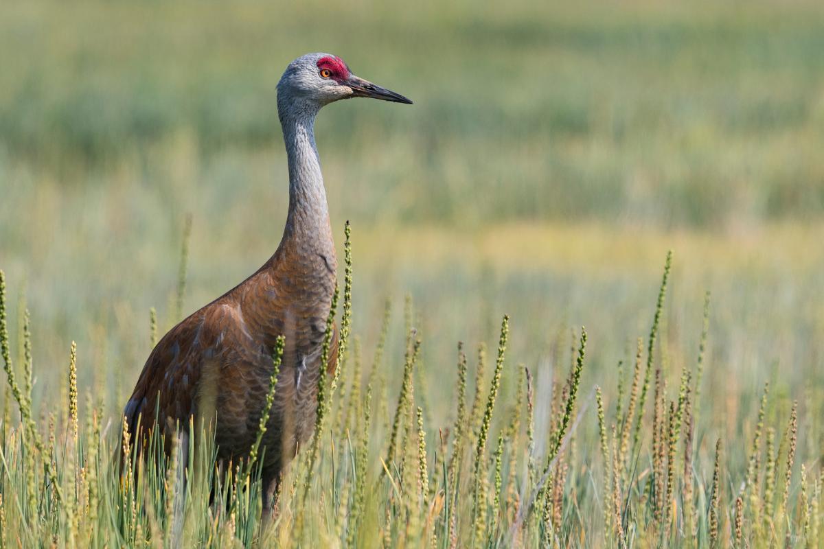 The sandhill crane inhabits grasslands, wetlands and open fields, feeding on a varied diet that includes roots, grains, insects and small vertebrates. It is known for its loud calls and dancing mating rituals that include jumping and coordinated movements between partners.
