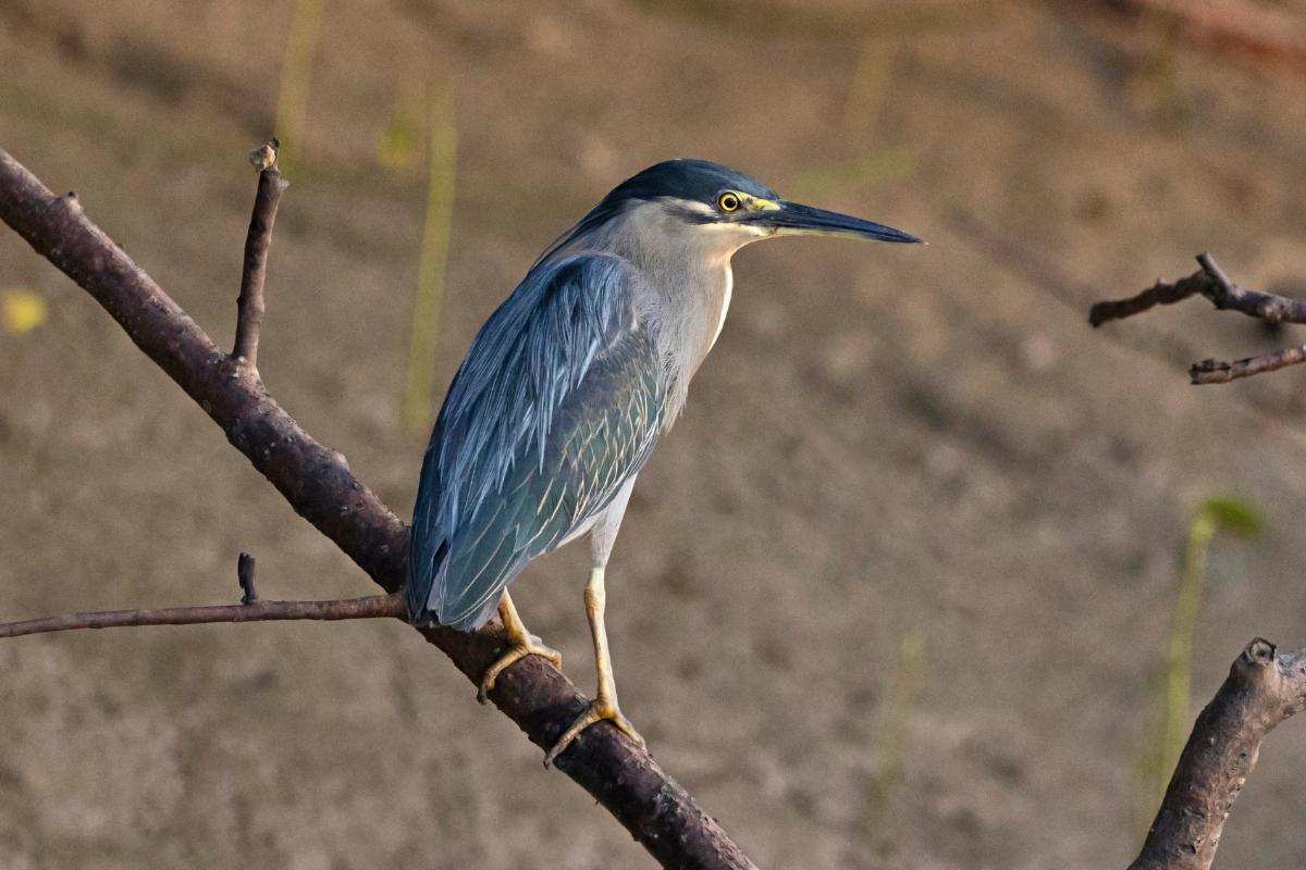 Also known as the little green heron or mangrove heron, the striated heron the blue heron, is a wading bird species native to the Americas, Asia, Africa and Oceania. It lives in both brackish and freshwater environments. Its crown and crest are greenish black, the anterior part of the neck and chest is ochre brown and the rest of the neck, abdomen and flanks are gray. Dorsally, it is gray, but without greenish reflections. It feeds on fish and small insects with its long beak.