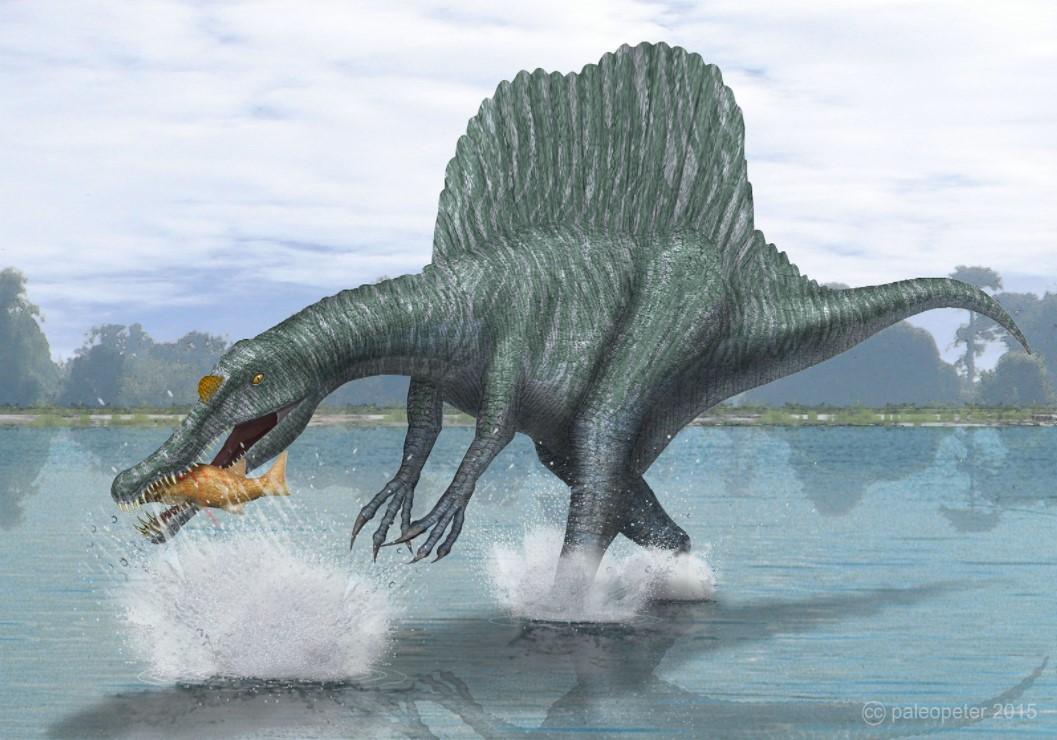 - Spinosaurus: this large theropod has a tail which resembles a modern thresher shark. Along with their elongated jaws, this suggests they were piscivorous. They may have slapped their tail to stun fish for consumption. Another appendage was a large sail on their back (depicted in picture below) which resembles a sailfish and served a hydrodynamic purpose. This means they were better able to move through water.