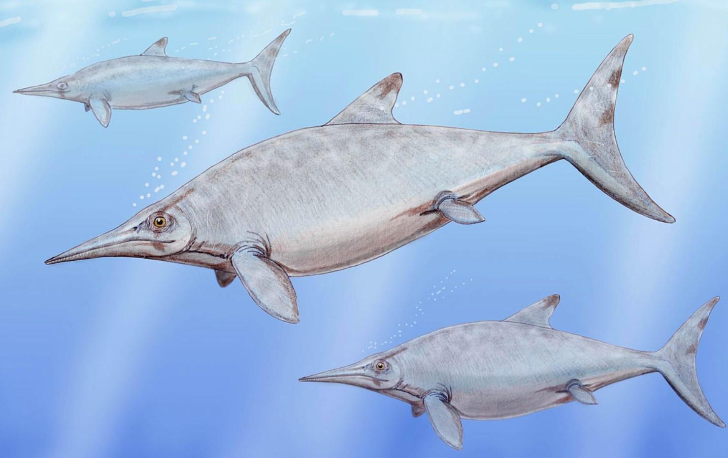 Ichthyosaurs like those of the Stenopterygius genus were very similar to today's dolphins, bearing a long snout, four pairs of fins, caudal fins and a dorsal fin. They were four meters long and was a species of viviparous animal, as are dolphins.