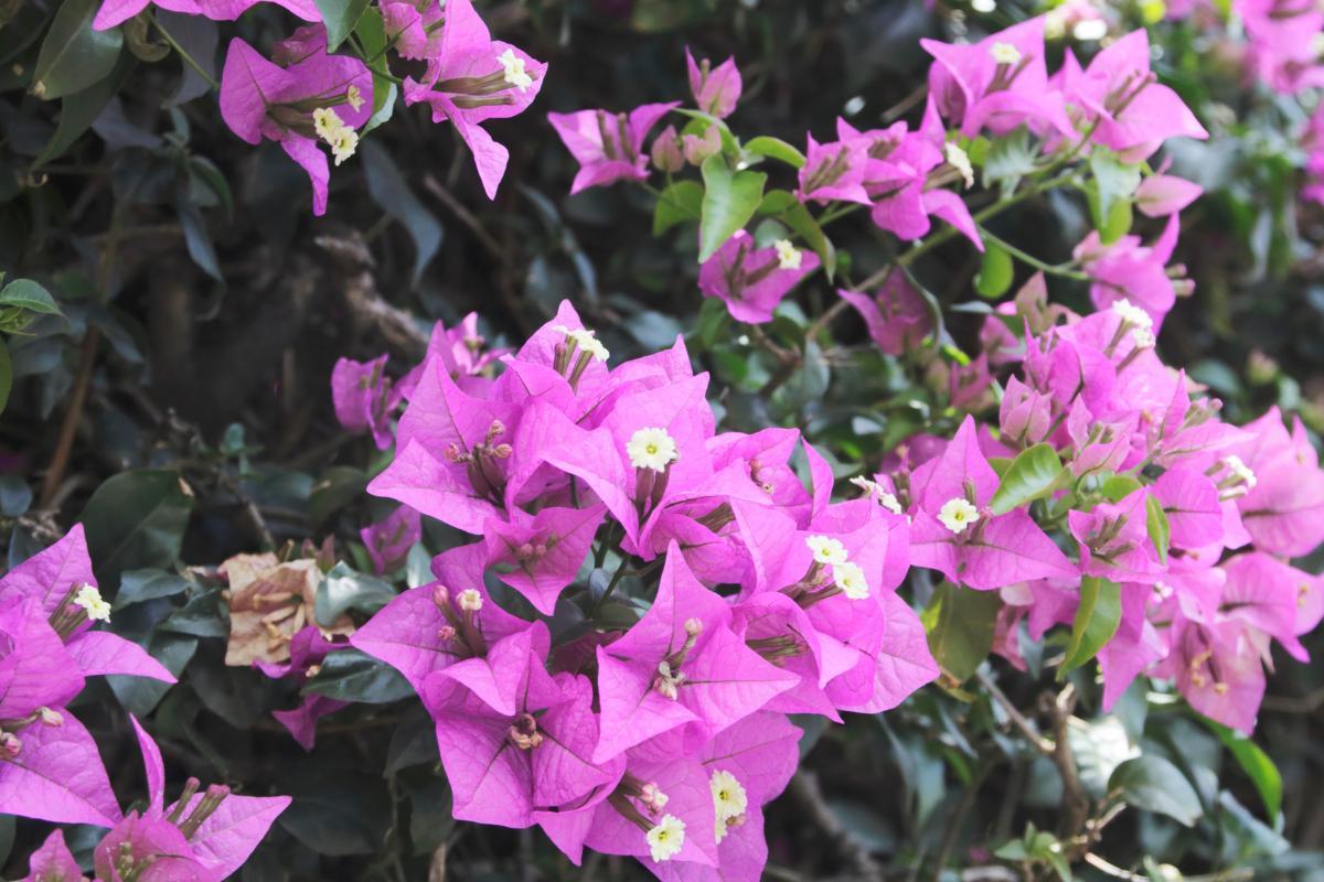 Bougainvillea fills gardens with vivid colors through its modified leaves called bracts, not true flowers. These range from deep pink and purple to orange, white, and yellow. What we think of as flowers are actually papery bracts surrounding tiny white flowers. These bracts keep their color for months, much longer than typical flower petals.