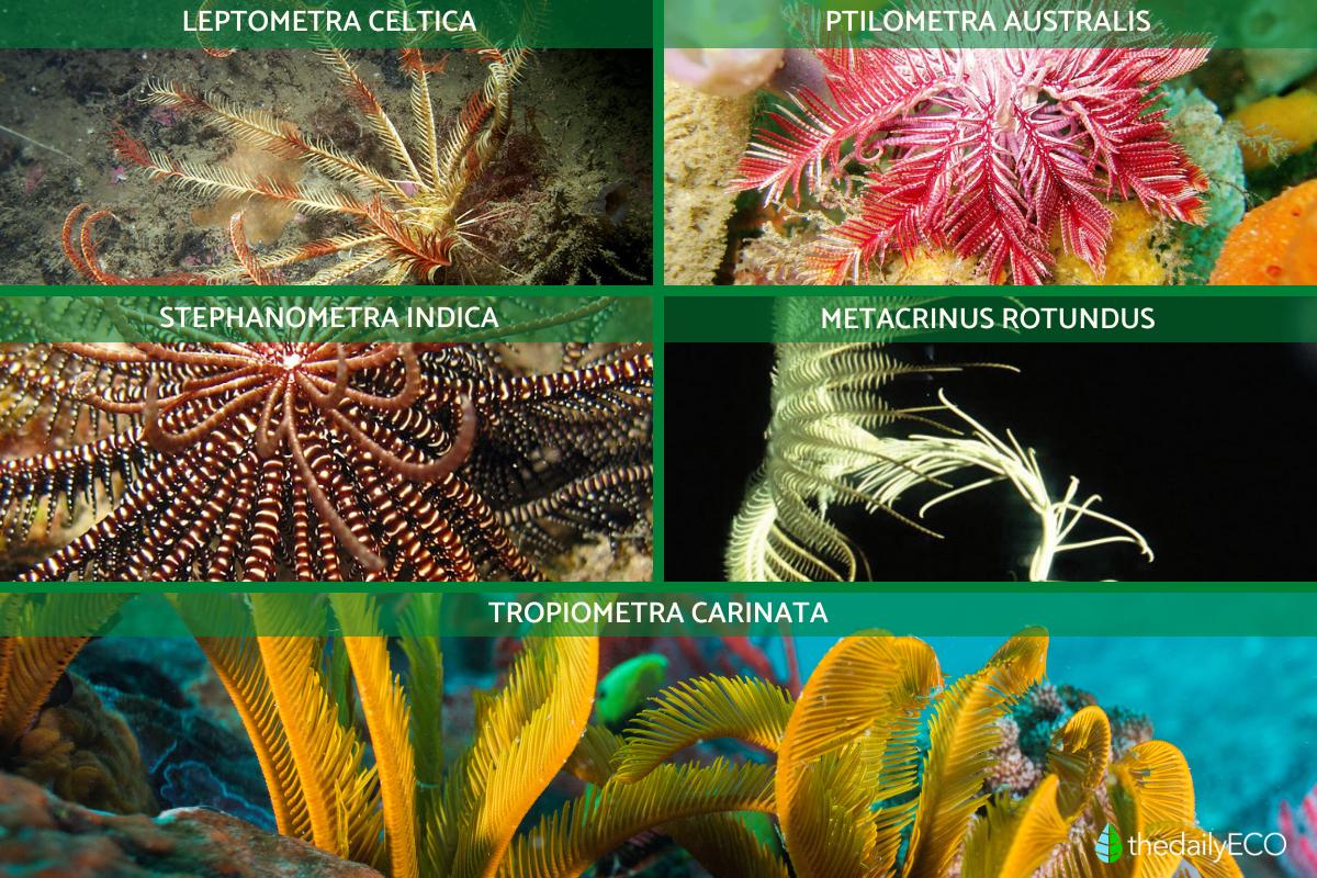 - Passion flower feather star (Ptilometra australis): native to the southeastern coasts of Australia, this species features 18–20 arms, each bordered with pinnules, which help capture food particles from the water.