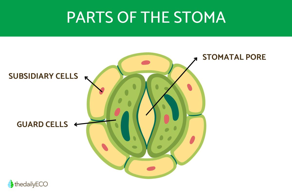 - Stomatal pore: this is the actual opening on the leaf surface through which gases, such as carbon dioxide and oxygen, enter and exit the plant. It's a microscopic aperture that can vary in size depending on the needs of the plant.