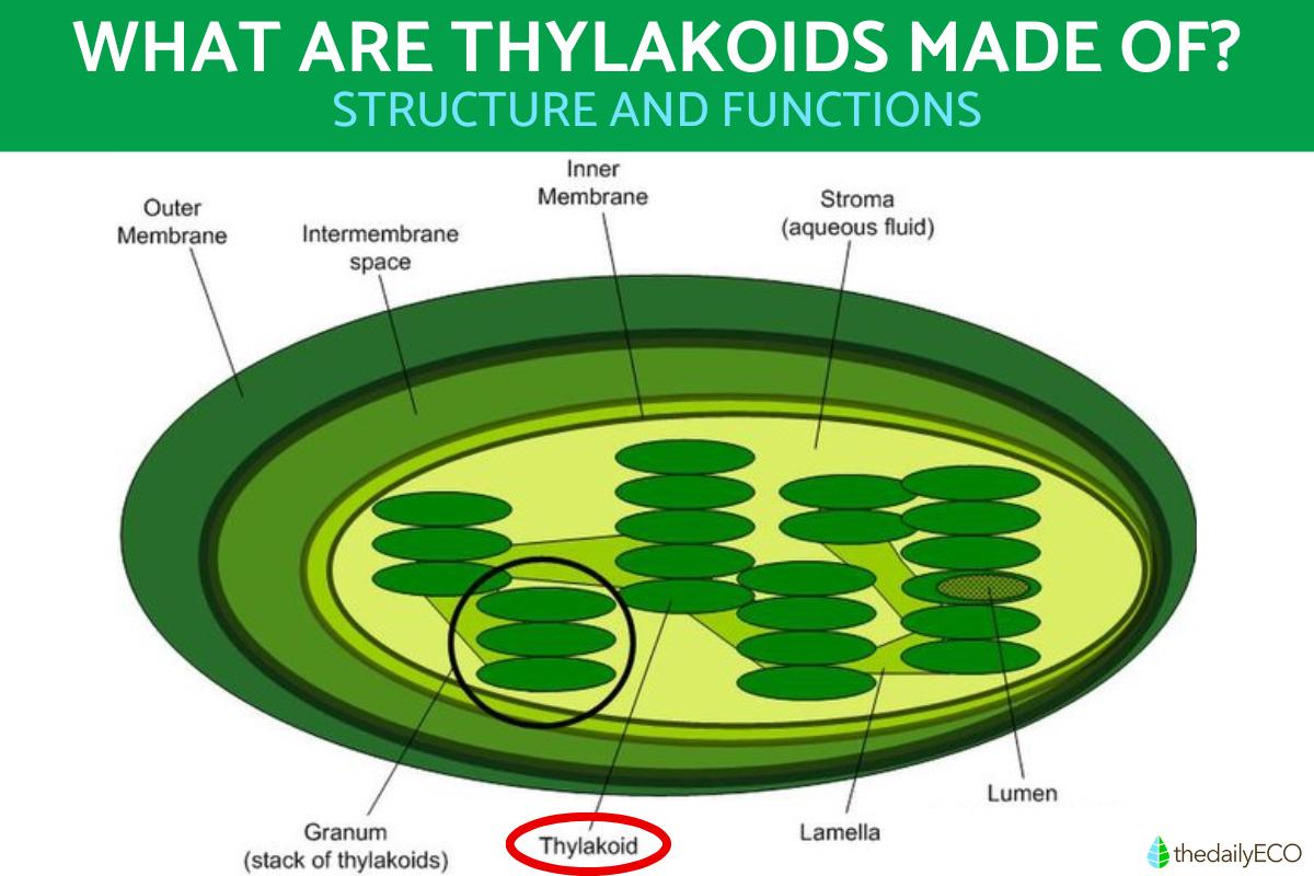Thylakoids are membranous structures which are contained within chloroplasts and cyanobacteria. They trap light energy and transduce it into the chemical energy forms known as ATP and NADPH. Thylakoids are structures where a lumen space is surrounded by a membrane. They are mainly composed of photosystems I and II, along with cytochrome b6 f and ATP synthase. In this article from thedailyECO, we learn more about the structure and function of thylakoids by asking what are thylakoids made of?