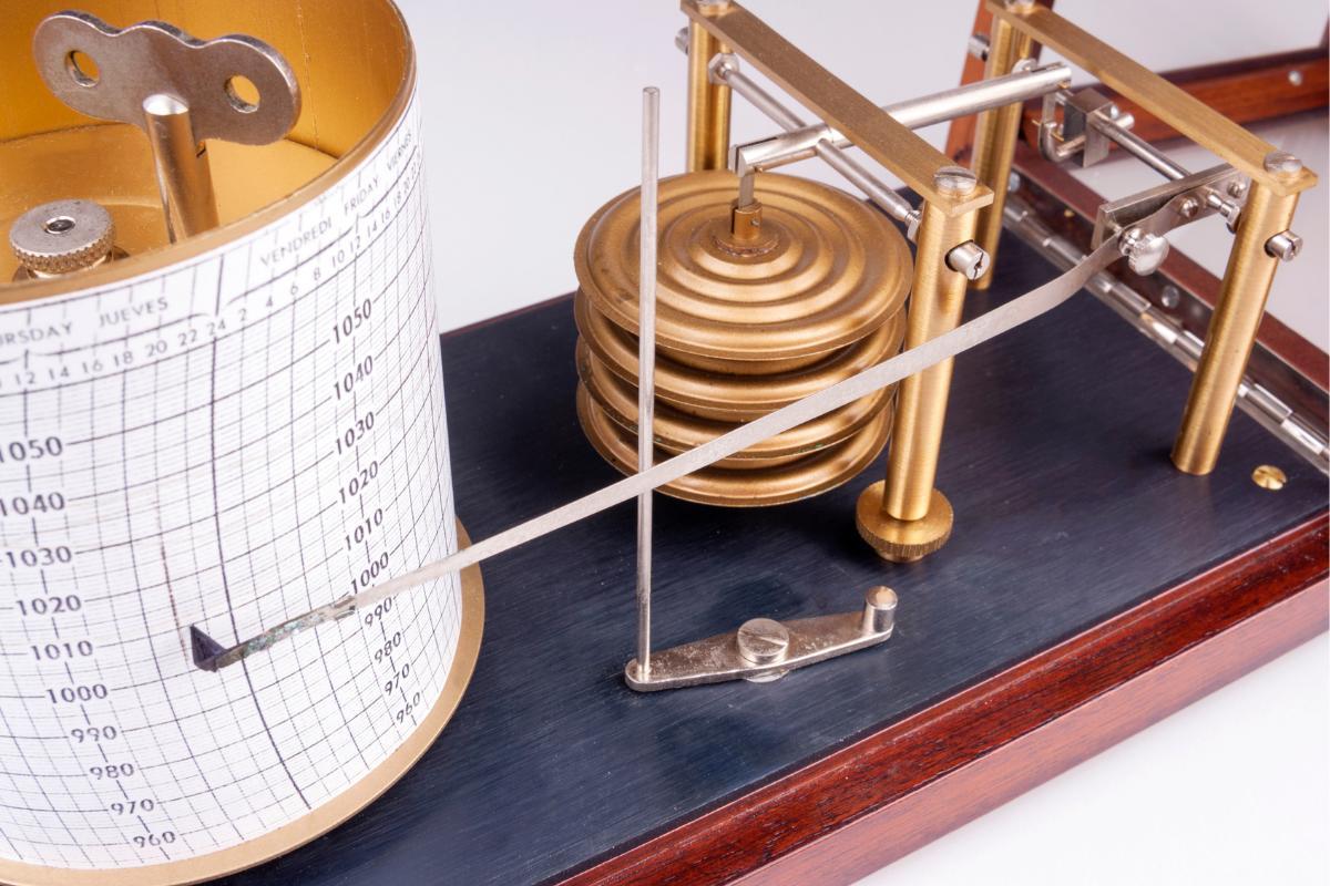 The barograph is a variation of the aneroid barometer that not only measures atmospheric pressure, but also records its changes over time. A barograph uses the same principle as the aneroid barometer (i.e. a capsule that deforms under pressure), but is equipped with a rotating drum covered with paper. A pen connected to the capsule mechanism draws a line on the paper, recording pressure changes over time.