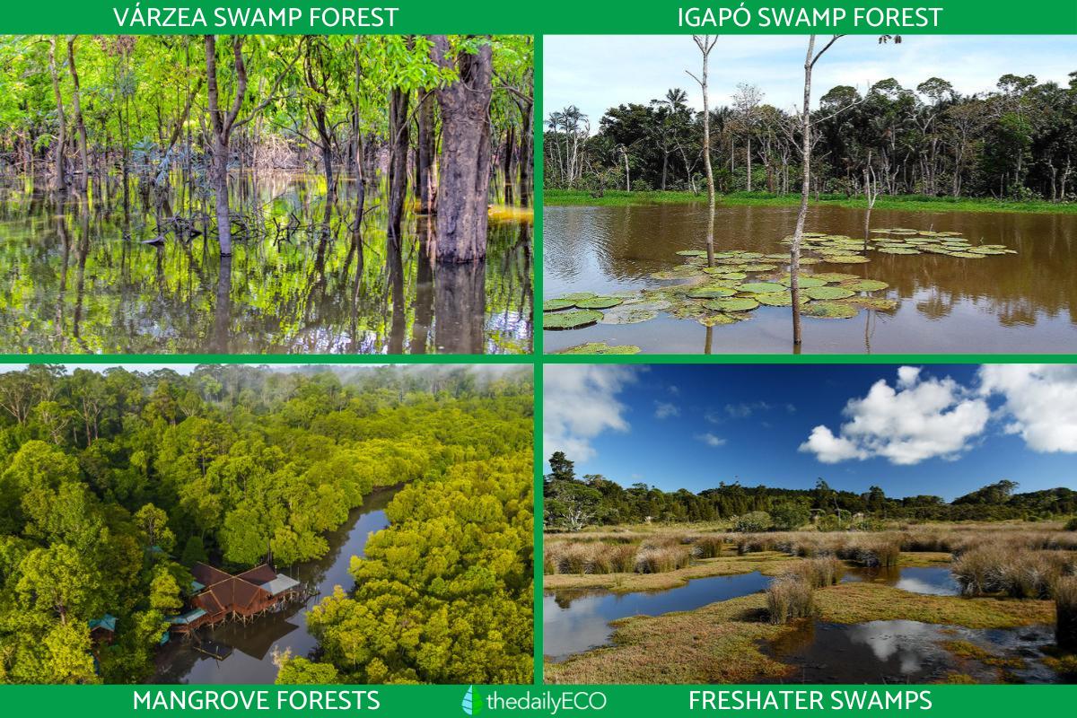 While all swamp forests will have the characteristics described above, they can also vary significantly between each other. This is due to aspects of their terrain, type of water or other factors. We see the types of flooded forests below: